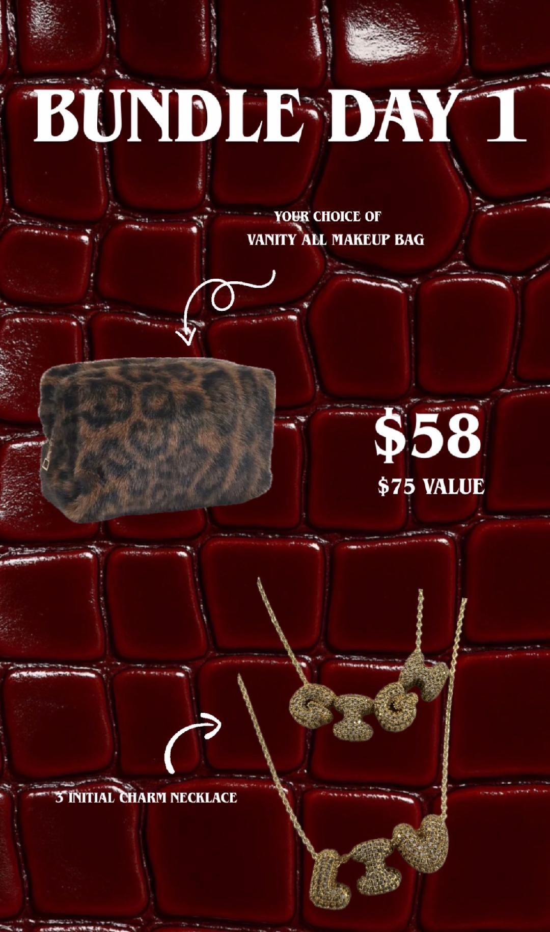 This bundle includes your choice of VANITY ALL BAG 2-3 INITIAL CHARMS (COMES WITH CHAIN)