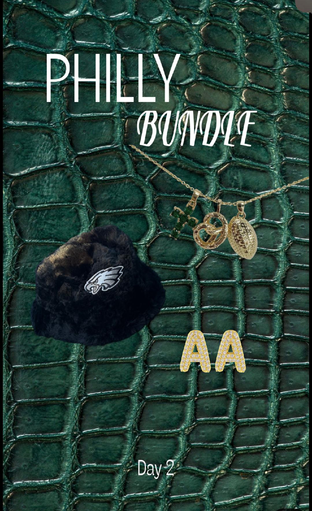 The Is the Philly bundle! Perfect for gifting or getting the perfect accessories for eagles game day. This bundle comes with our black fluffy bucket hat our Philly charm necklace that includes a pretzel charm, football charm and green cross charm. Also includes iced monogram initial earrings.