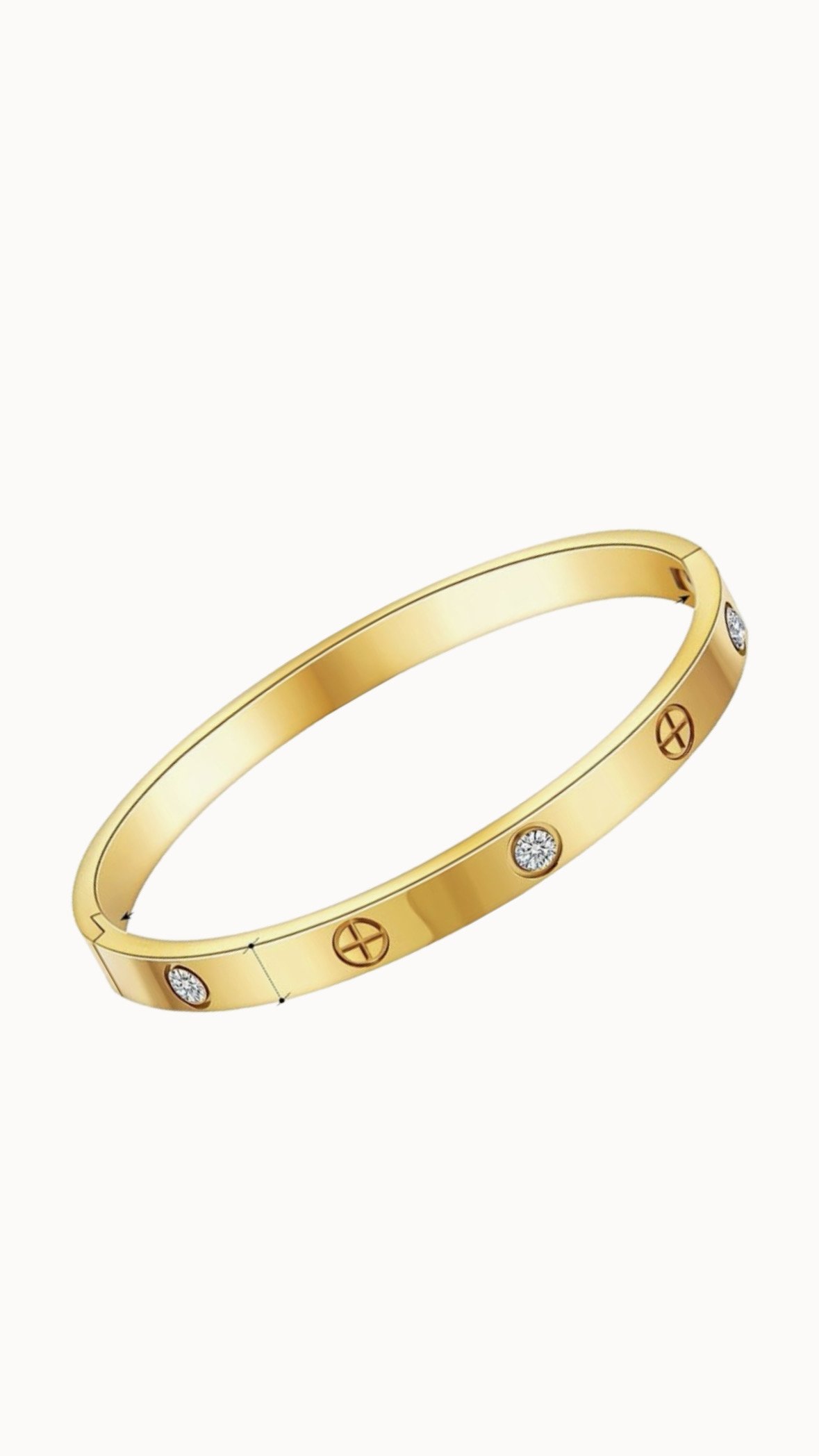 The iconic gold bangle is a fundamental part of every bracelet stack. Our PER SEMPRE BRACELET is crafted from 18k gold plated stainless steel. Clips on easily with an elegant shine. We recommend wearing yours stacked with multiple PER SEMPRE BRACELET and with our tennis bracelets.